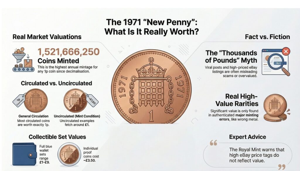 There are frequently viral social media posts claiming these coins are worth thousands of pounds. Experts from The Royal Mint and Change Checker warn that these “rare” listings on sites like eBay for thousands of pounds are misleading scams. The high price tags on those listings do not reflect actual market value; most buyers can pick up a 1971 1p for about £1, including postage.